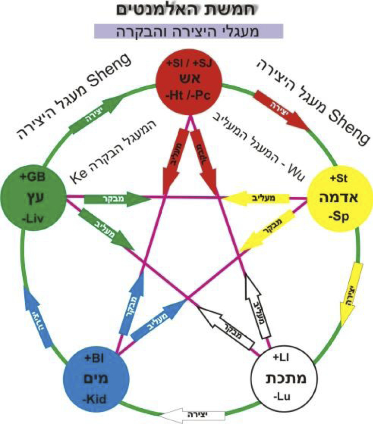 יחסי הגומלין בין האלמנטים, המייצגים את הכוחות הפועלים בטבע, מתוארים במעגלים שונים. יש מעגלים המתארים מצבים של הרמוניה מחזורית אידיאלית בין כל האלמנטים היוצרים זה את זה. מעגלים אחרים מתאים מצבים של דיסהרמוניה שבהם האלמנטים יוצאים מכלל איזון והורסים זה את זה. הרמוניה ואיזון הם, כזכור, הרעיונות המרכזיים העומדים בבסיס תורת הרפואה הסינית.